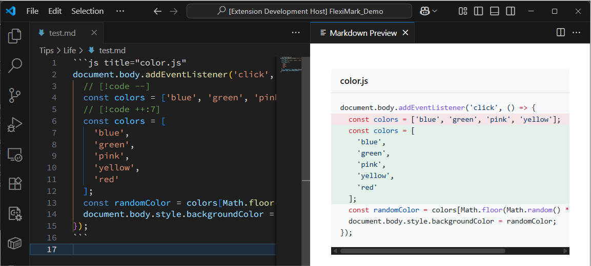In addition to syntax highlighting, code blocks support titles, line numbers, line highlighting, word highlighting, and diff highlighting.