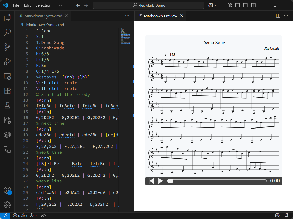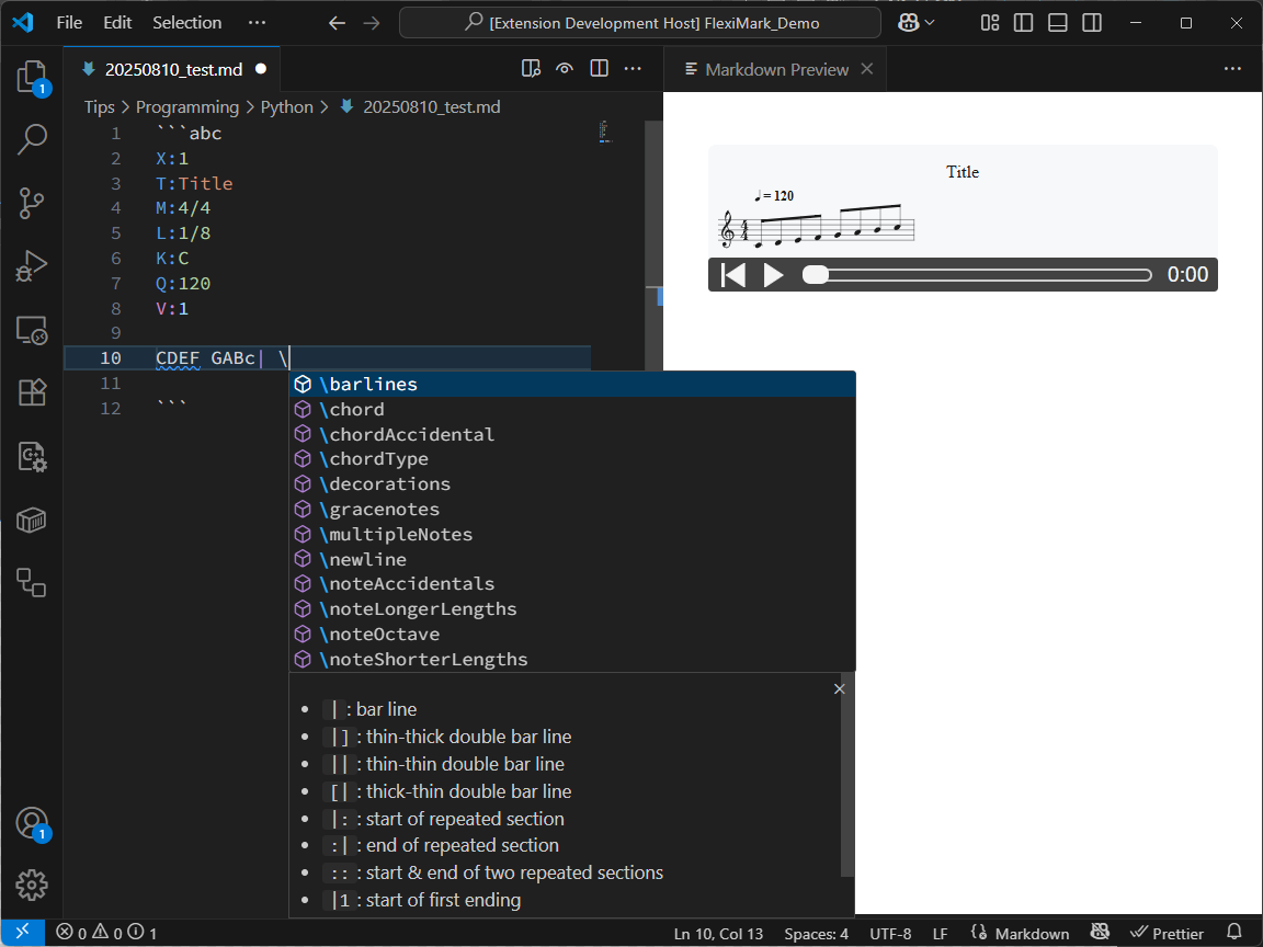 Inside an ABC code block, typing a backslash (\) will trigger ABC notation snippets.
