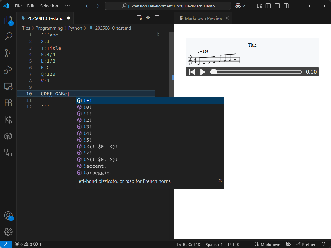 Typing an exclamation mark (!) inside an ABC code block will trigger symbol snippets.